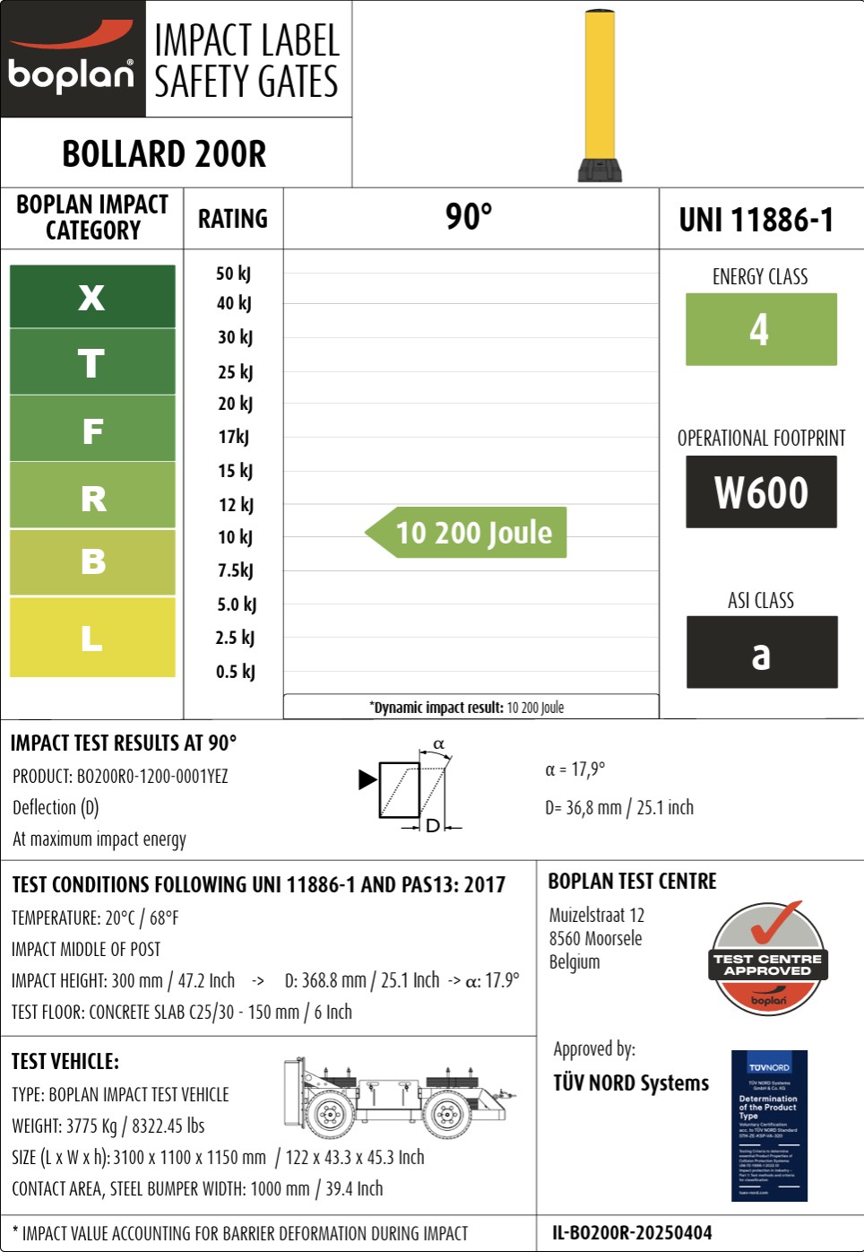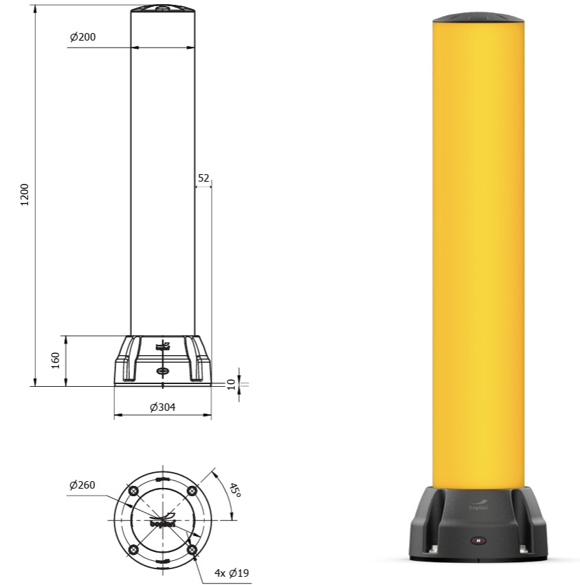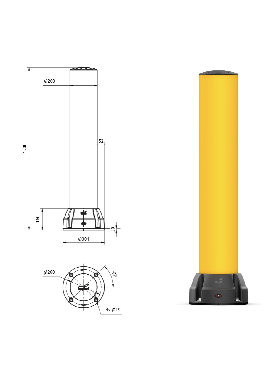 BO200R pagamintas iš Extrilene® – aukštos kokybės polimero, atsparaus pakartotiniams smūgiams. Po kiekvieno susidūrimo atsiradusi deformacija išnyksta transporto priemonei atšokus. Taip pat galimas variantas su nuimama tvirtinimo plokšte.